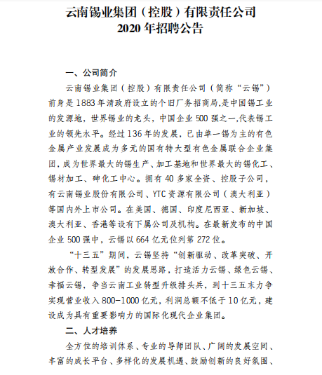 云南錫業集團(控股)有限責任公司2020年招聘公告