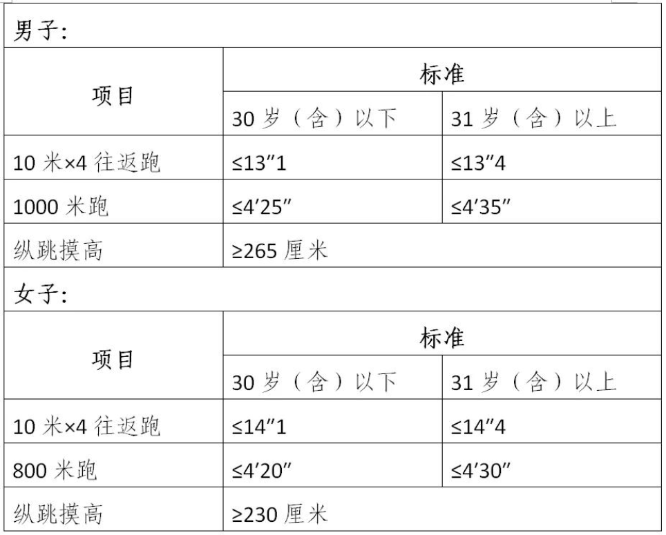 其標準按照招錄人民警察標準(人社部發〔2011〕48號)執行,達不到以下標準的視為體能測評不合格。體能測評標準為: