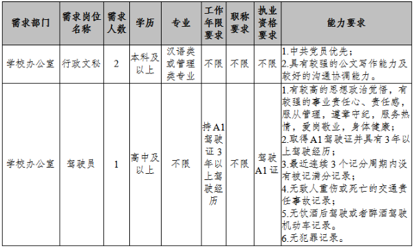 為適應學校發展的需要,需面向社會誠聘2名行政人員及1名駕駛員,現將有關事項公告如下: