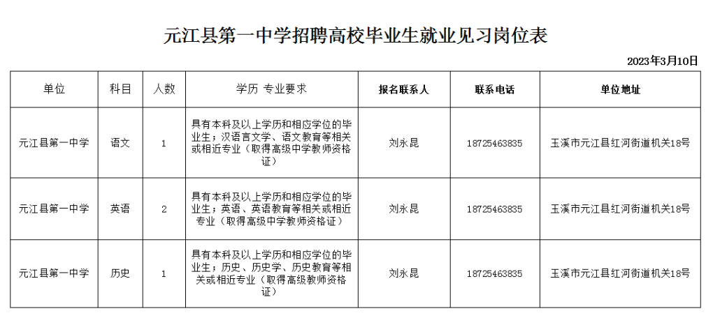 玉溪市元江縣第一中學招聘就業見習人員公告