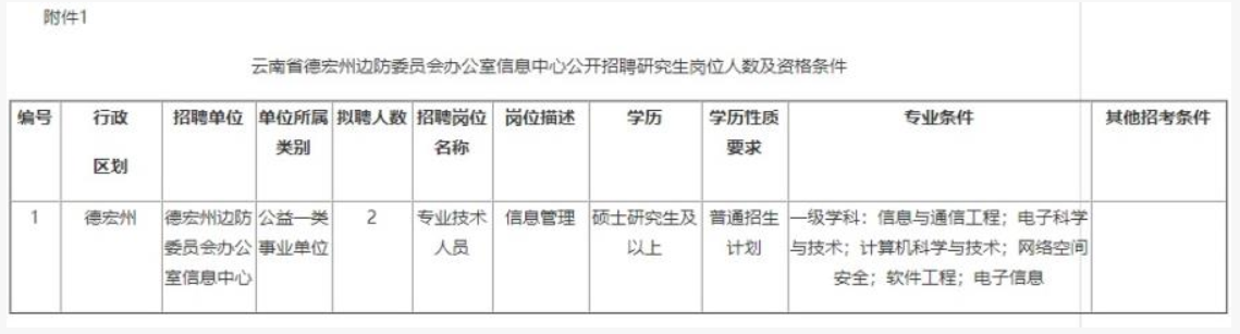 本次面向社會公開招聘碩士及以上研究生學歷人員2名(德宏州邊防委員會辦公室信息中心事業專技人員2名),具體崗位、條件、要求等詳見(附表1)。