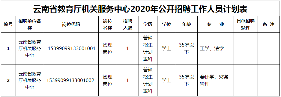 公開招聘管理崗位工作人員2名;凡符合條件的人員均可報名參加本次公開招聘。招聘范圍和條件(詳見附件1《云南省教育廳機關服務中心2020年公開招聘計劃表》),年齡計算截止日期2020年9月1日。